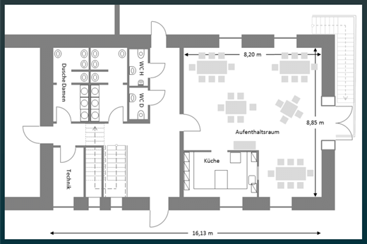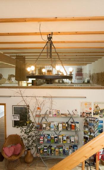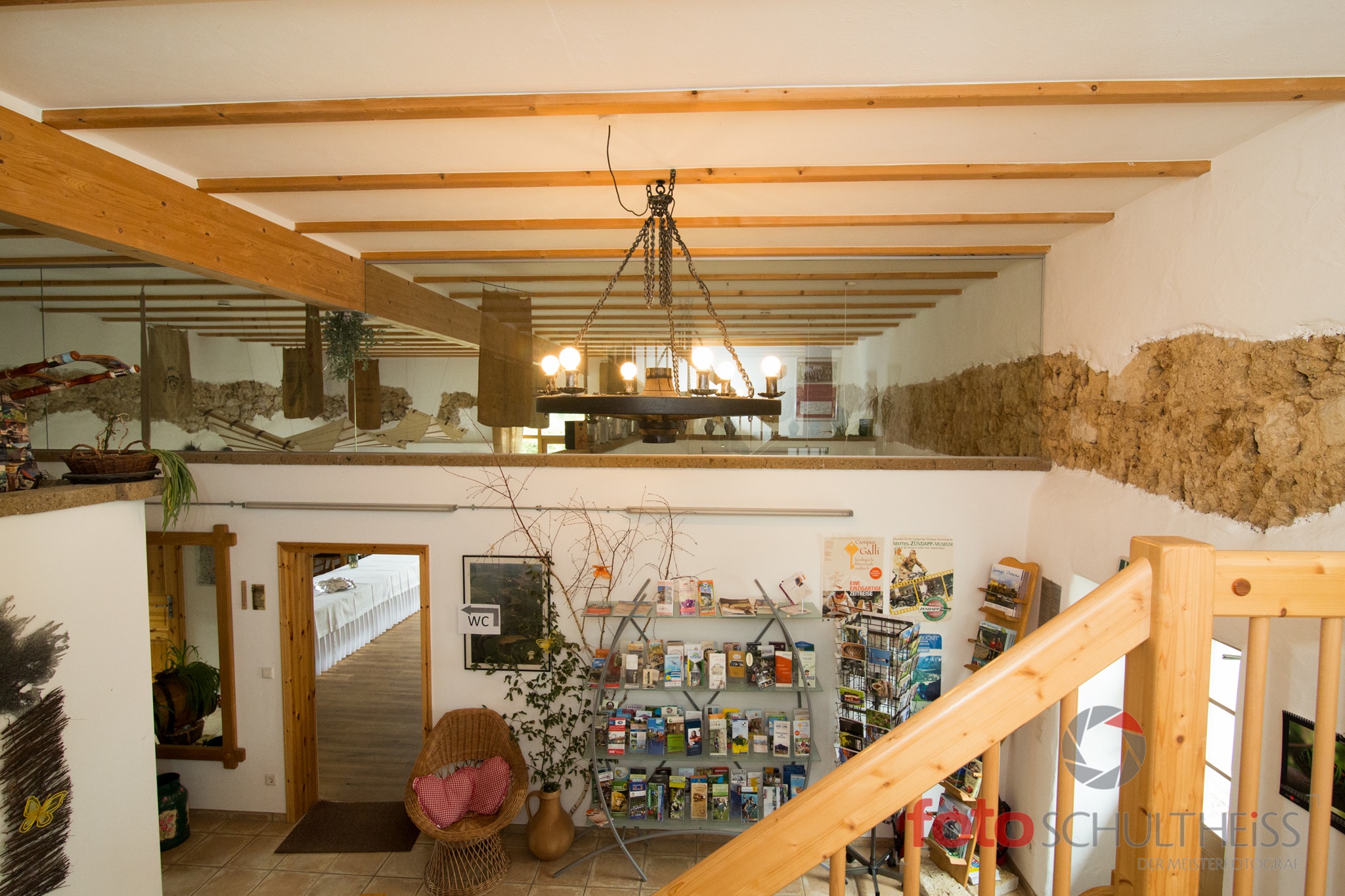 Im unteren Teil des Gebäudes befindet sich der gemütliche lichtdurchflutete Aufenthaltsraum, der bei Bedarf zusätzlich mit einem Bullerjan Ofen beheizt werden kann, sowie Sanitärräume (Duschen, Waschbecken, WC)